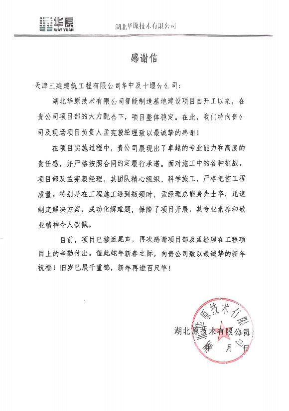 感 謝 信 天津三建建筑工程有限公司華中及十堰分么司: 湖北華原技術(shù)有限公司智能制造基地建設(shè)項(xiàng)目自開工以來,在責(zé)公司項(xiàng)目部的大力配合下,項(xiàng)目整體穩(wěn)定。在此,我們特向貴公司及現(xiàn)場(chǎng)項(xiàng)目負(fù)責(zé)人孟憲毅經(jīng)理致以最誠摯的感謝! 在項(xiàng)目實(shí)施過程中,貴公司展現(xiàn)出了卓越的專業(yè)能力和高度的責(zé)任感,并嚴(yán)格按照合同約定履行承諾。面對(duì)施工中...